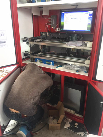 圖為工作人員正在對發(fā)卡機內(nèi)部進(jìn)行接線