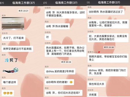 “太冷了,崗亭空調(diào)全都運行不起來了?!?/span> “每個崗亭都一樣?!?/span> “冷死啦!” “修空調(diào)的師傅來了,檢查了一下,他說這個沒辦法,是因為天氣太冷的原因,并不是壞了。” “大家衣服趕緊多穿點,誰有舊的工作大衣?!?/span> “熱水袋灌起來,不夠,我的拿去先用?!?/span> “我也有舊大衣。”