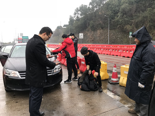 31日是春運的前一天,下起了今年的第一場大雪。當天10:30分左右,三號車道如往常一樣正常、有序,該車道正在檢查綠農(nóng)車。這時一輛牌照為浙JVIT6*黑色小轎車緩緩駛?cè)耄蝗辉撥嚰铀僬{(diào)整方向,想朝二號車道沖去。與此同時從它后方快速沖出一輛轎車檔在了該車前面,接著后方又沖出一輛黑色轎車,攔截在該車后方的去路。兩輛車上跳下幾個大漢,以迅雷不及掩耳之勢,一擁而上干脆利落的將車內(nèi)三名犯罪嫌疑人控制。 當班收費員被這一幕驚呆了,不過迅速反應過來,啟動應急預案,呼叫監(jiān)控員,監(jiān)控員在監(jiān)控視頻中發(fā)現(xiàn)這個情況后,第一時間通知所長。所長孫明偉得知情況后立即趕赴現(xiàn)場,確認核實身份,并令當班班長第一時間聯(lián)系當?shù)嘏沙鏊藢嵣矸?。在得到明確的答復后,工作人員立刻封閉該車道,為民警辦案提供方便,并打開備用車道正常收費疏導過往車輛,組織人員疏散圍觀群眾避免車輛和人員停留過多影響民警辦案。