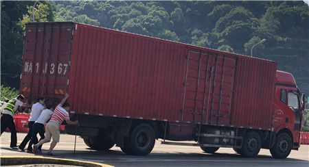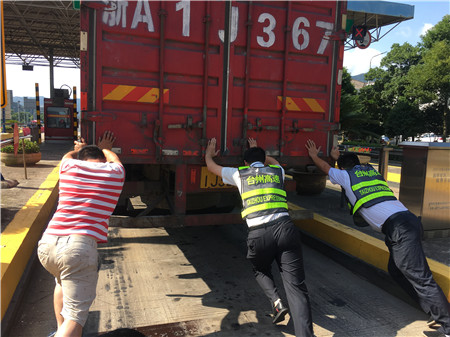 6月19日15時(shí)左右,一輛杭州牌照的大貨車(chē),在進(jìn)入臨海南收費(fèi)所三車(chē)道時(shí)突然熄火拋錨,司機(jī)嘗試了幾次無(wú)法啟動(dòng),立刻下車(chē)檢查車(chē)況。 “師傅,怎么了?有什么能幫您?”收費(fèi)員徐海源見(jiàn)此情景,立即上前熱心詢問(wèn)。 “哎!包在油箱口的塑料紙?jiān)趺淳偷暨M(jìn)油箱內(nèi),現(xiàn)在車(chē)子怎么都發(fā)不動(dòng)不了?!彼緳C(jī)有點(diǎn)發(fā)急地回答。 “師傅,別著急,我先找?guī)讉€(gè)同事幫您把車(chē)推出車(chē)道?!笔召M(fèi)員趕緊安慰司機(jī)焦急心情。 “好的,那謝謝你們。”司機(jī)連忙點(diǎn)著頭。為了避免車(chē)道堵車(chē),徐海源立刻利用對(duì)講機(jī)向當(dāng)班班長(zhǎng)周萍說(shuō)明情況,周萍立刻關(guān)閉該車(chē)道,啟動(dòng)備用車(chē)道。此時(shí)此刻,收費(fèi)員李俊杰、楊旭佳毫不猶豫的趕了過(guò)來(lái)與駕駛員一起推動(dòng)車(chē)子?!耙?、二、三,一、二、三,使勁呀……”可是車(chē)子仍然紋絲不動(dòng)。怎么辦?請(qǐng)求支援!正準(zhǔn)備下班的行政人員陳瑩、劉華萍得知情況后,二話不說(shuō)飛奔到車(chē)道,加入到推車(chē)行列中。用力推呀——哎,不行;再來(lái)一次——還不行。面對(duì)23.97噸的大貨車(chē),大家仍是束手無(wú)策?!叭フ腋F棒試試!有道是給你一根鐵棒,我能翹起整個(gè)地球。”不知是誰(shuí)大喊了一聲?!靶校梢栽囋?,快去找”話音剛落李俊杰快步跑向所內(nèi),尋找鐵棒。不一會(huì)兒,只見(jiàn)他興奮地高舉鐵棒沖著大家喊道:“找到了!找到了!”