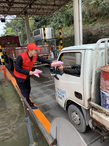 圖為志愿服務(wù)隊合影 “師傅,您好,您知道連續(xù)行車4小時,必須停車休息多少時間以上嗎?” “至少20分鐘以上吧。” “在高速公路上行車,如果車輛發(fā)生故障、事故等情況,請問您應(yīng)該怎么處置呢?” “立即靠右側(cè)停車,打開報警閃光燈,在車輛后方150米以外放置三角警示牌,車內(nèi)所有人員下車轉(zhuǎn)移至護欄外等安全地帶。” “請問?如果車輛超載(員),車子在行駛過程中,會出現(xiàn)哪些狀況嗎?” “應(yīng)該容易引發(fā)爆胎、突然偏駛、制動失靈、翻車等情況。”