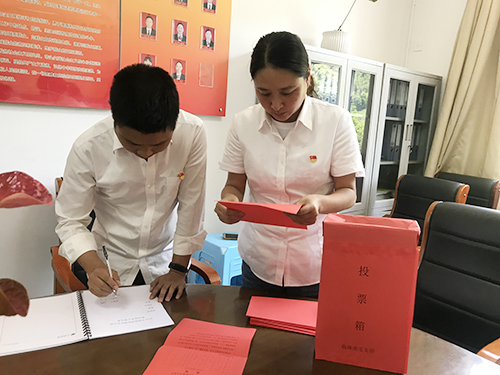圖為投票現(xiàn)場 會議通過舉手表決方式一致通過了選舉辦法和監(jiān)票人、計票人名單。本次選舉大會應(yīng)到正式黨員11名,實到10名。經(jīng)過計票、監(jiān)票等程序,以差額無記名方式推選孫明偉、周戰(zhàn)、陳瑩三名同志為新一屆支部委員會委員。在隨后召開的支委會第一次會議上,選舉孫明偉任支部書記,周戰(zhàn)任紀(jì)律委員,陳瑩任組織宣傳委員。