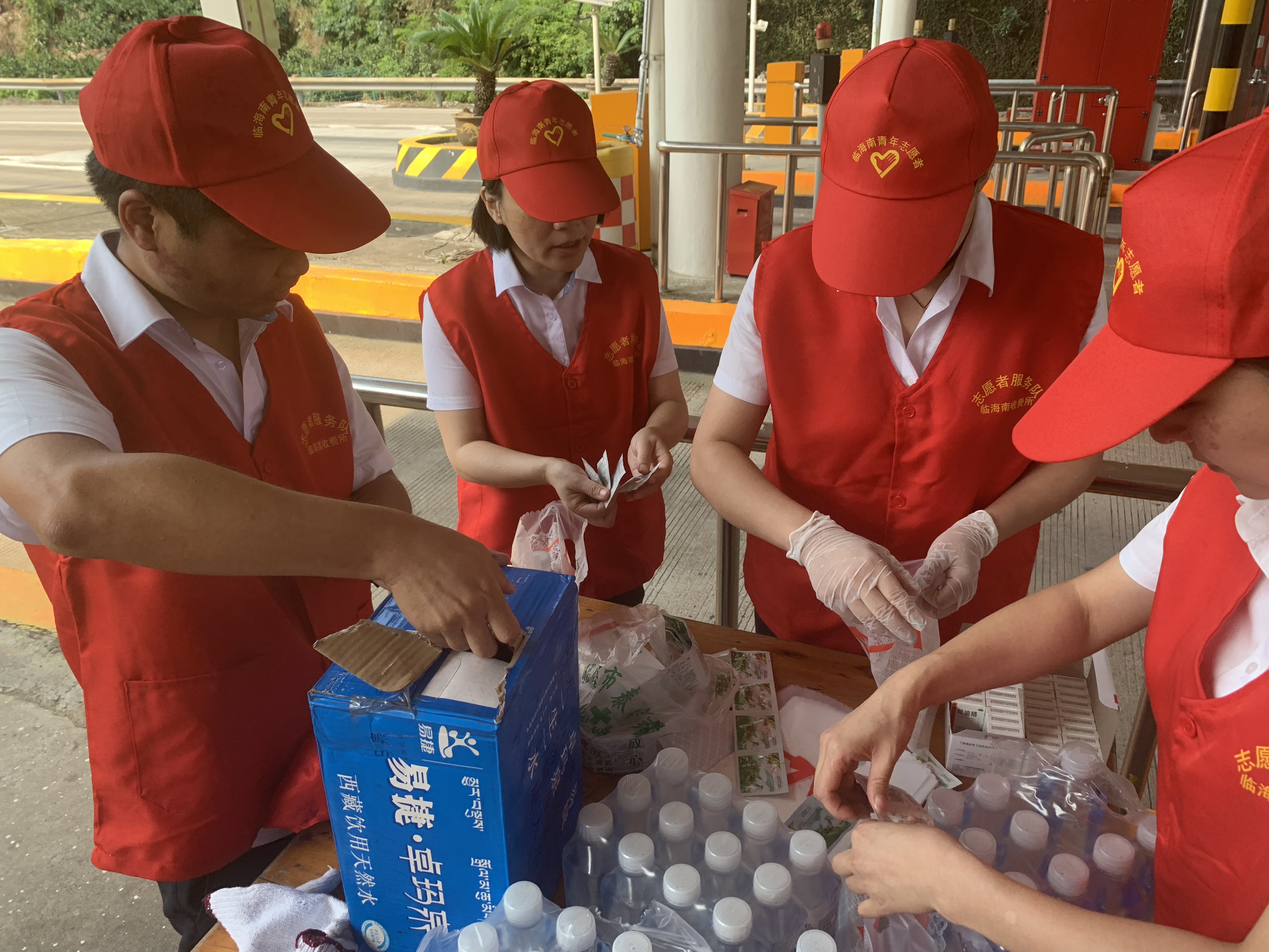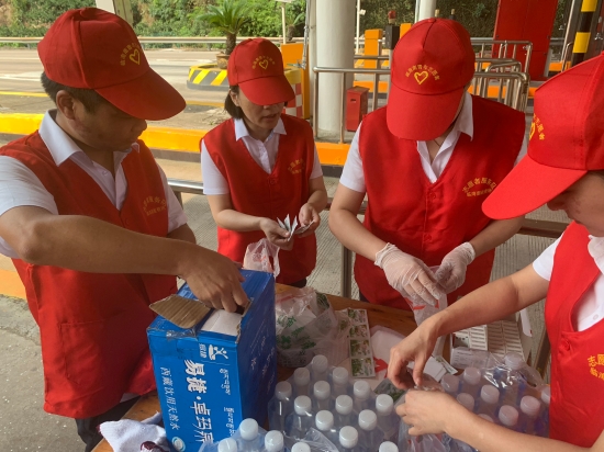 圖為志愿者在準備防暑物品 “師傅,辛苦啦!這袋子里有礦泉水、風油精、人丹一些防暑物品,您拿好,路上帶著以備不時之需!” “沒想到,你們收費站還有這個服務(wù),這次我要出趟遠門,說不定路上還真能用的上,謝謝呀!”一位接過禮品袋的老師傅連聲道謝。