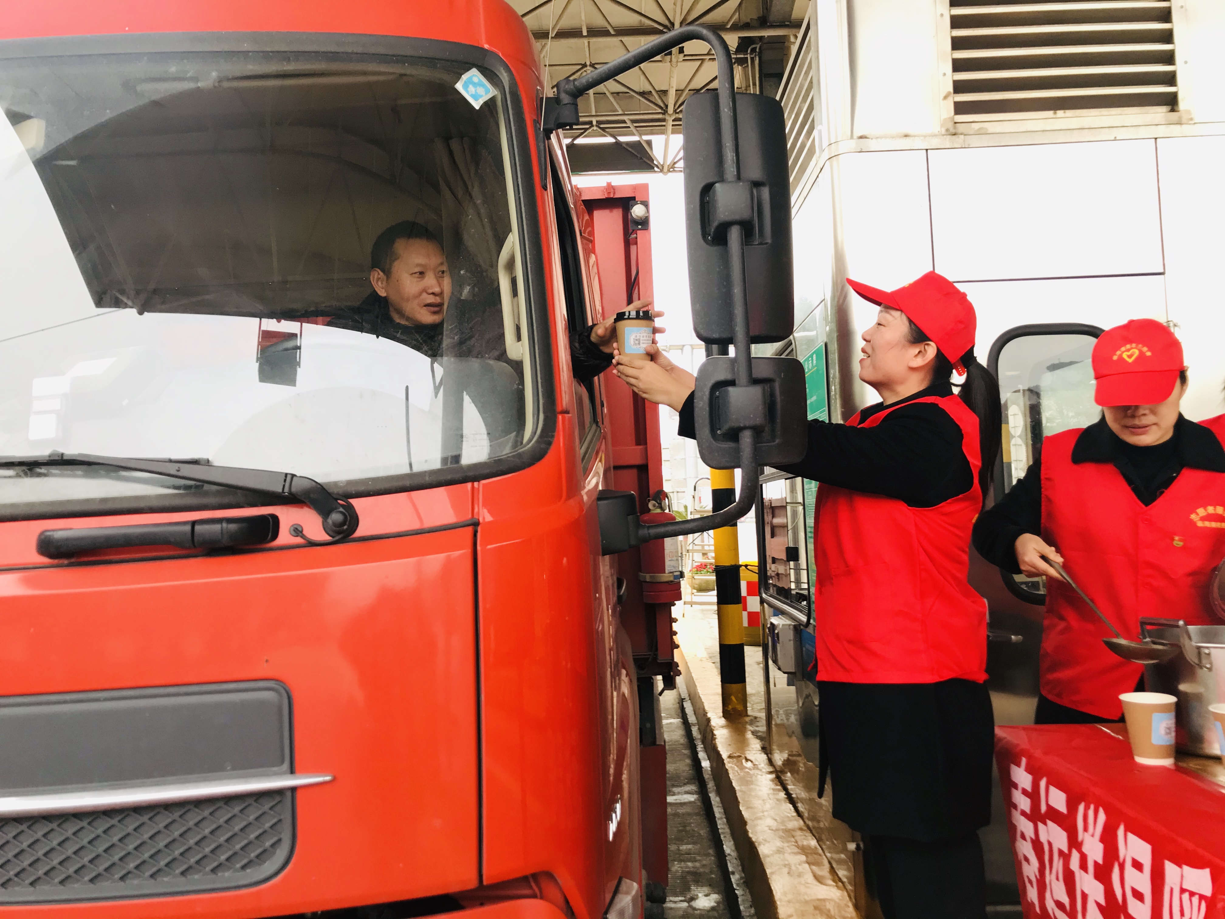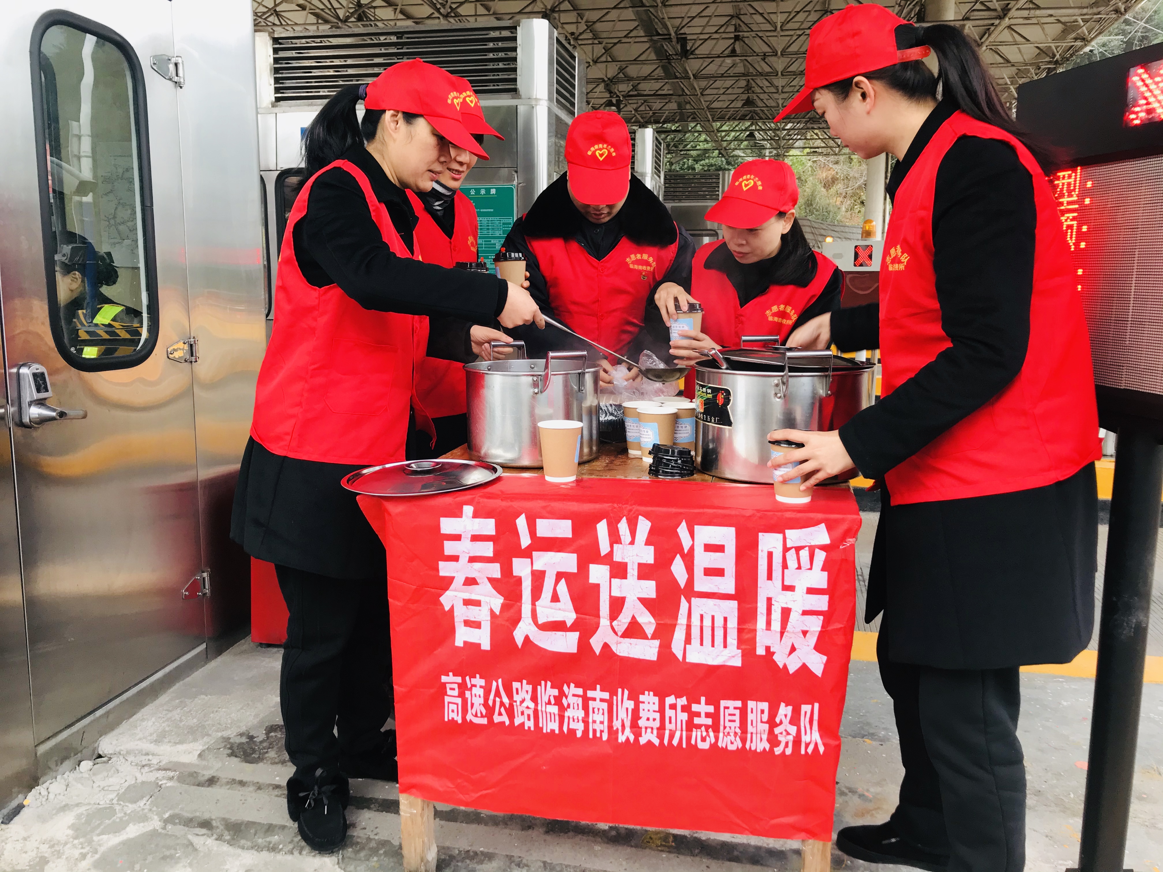圖為送溫暖活動(dòng)現(xiàn)場(chǎng) 活動(dòng)當(dāng)天,雖然氣溫較低,但在臨海南收費(fèi)所出口處,身著紅色馬甲的志愿者們頂著嚴(yán)寒,依然熱情地為過(guò)往司乘人員遞上一杯杯滾燙的姜茶、紅棗茶,并向他們提供問(wèn)詢、指路、飲水和提示路況信息等便捷服務(wù)。除了設(shè)置志愿者便民服務(wù)臺(tái),臨海南收費(fèi)所還為過(guò)往駕駛員和出行旅客臨時(shí)增設(shè)休息室,提供道路溫馨提示服務(wù),同時(shí)還在車(chē)道配備了飲水機(jī)、藥品、修車(chē)工具等免費(fèi)便民物品。