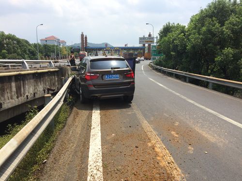8月13日上午10:30分左右,臺州收費所出口寧向匝道口有一輛黑色寶馬X3斜靠在護(hù)欄旁,其車頭左側(cè)因碰撞護(hù)欄而嚴(yán)重凹陷,左前輪胎報廢。 當(dāng)時,該所出口五號車道的欄桿發(fā)生故障,需要暫時關(guān)閉進(jìn)行維修。班長張海勇在內(nèi)廣場引導(dǎo)車輛時發(fā)現(xiàn)此起事故,走近細(xì)看,由于碰撞激烈該車前檔玻璃破裂,前排安全氣囊彈出,而車旁的兩個人驚恐未定不知所措。此時匝道口車流不斷,因駕駛員遲遲找不到三角牌,為避免二次事故的發(fā)生,張海勇在車后方指揮交通,并提醒車旁人員站在護(hù)欄外安全位置,同時報告指揮中心事故車的位置和損傷情況。