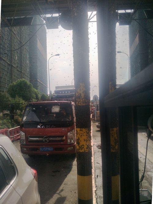 圖為蜜蜂集聚在收費(fèi)站 原來(lái)這輛綠通車(chē)運(yùn)輸蜂箱,由于蜂箱沒(méi)有關(guān)閉嚴(yán)實(shí),在車(chē)通過(guò)車(chē)道檢查稍作停留時(shí),大量的蜜蜂乘機(jī)逃出,圍攻收費(fèi)崗?fù)?,天空瞬間一片密密麻麻。它們有的停留在車(chē)道的防撞柱上,有的在收費(fèi)窗口附近盤(pán)旋,遲遲不肯離開(kāi),嚇得過(guò)收費(fèi)站等待繳費(fèi)的司機(jī)不敢開(kāi)車(chē)窗繳費(fèi)。