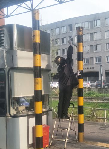 圖為工作人員用殺蟲(chóng)劑噴射蜜蜂 當(dāng)班副班長(zhǎng)何丹燕立即將車(chē)道內(nèi)情況報(bào)告給所領(lǐng)導(dǎo),副所長(zhǎng)何先林聽(tīng)聞后急急披上雨衣,戴上頭盔和手套,迅速趕到車(chē)道,經(jīng)過(guò)簡(jiǎn)單防護(hù)的他用殺蟲(chóng)劑噴射蜜蜂集聚的位置。與此同時(shí),何丹燕疏導(dǎo)后方車(chē)輛從其他車(chē)道通行。