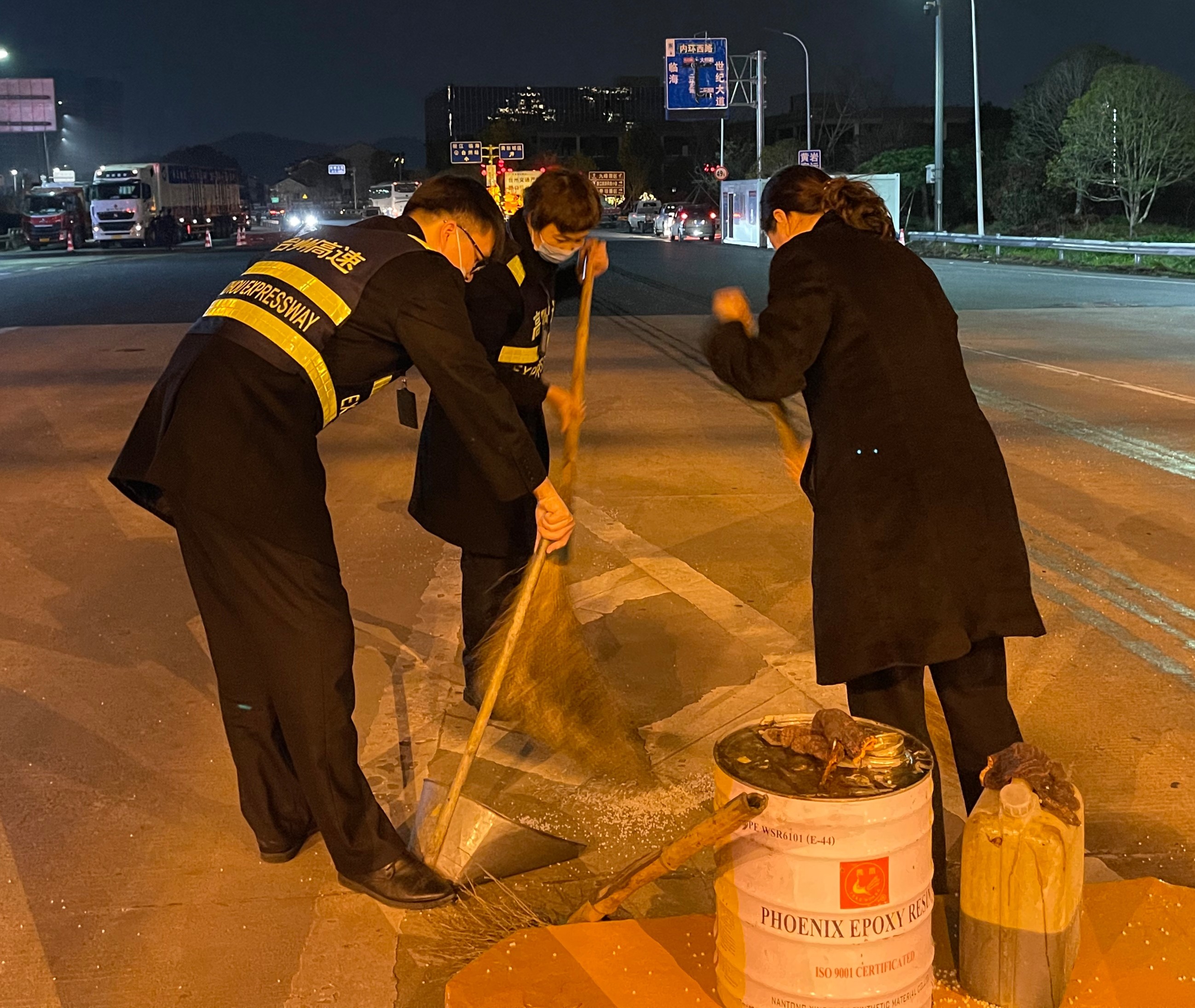 (圖為工作人員在清掃) 一時之間,車道路面上落滿大量的塑料顆粒,考慮到夜色已深,ETC車道上行駛的車輛速度大多很快,萬一司機沒有及時發(fā)現(xiàn)前方道路上的灑落物,極易造成輪胎打滑,嚴重影響行車安全。情況緊急,為了后續(xù)通行車輛的安全,收費班長立刻關閉了該ETC車道,并放置警示標志,然后將這一情況上報給監(jiān)控中心和收費所值班人員。不等清潔人員到來,收費員羅時杰從車道的工具房拿出掃帚和簸箕,主動開始清掃工作。隨后其他不坐崗的收費員也投入到了清掃工作中,這支臨時清掃小隊在沒有任何人的領導下自發(fā)地組織起來。這時,從高速上完成機電養(yǎng)護工作的機電班工作人員正巧路過,他們看到這一幕立刻將車??吭谝贿叄尤肭鍜哧犖?。盡管散落的塑料顆粒數(shù)量較多,但在大家的共同努力下,車道終于被清理干凈,恢復了正常通車。 春日的夜晚微風拂過,已有春的暖意,而更暖的是這一幕在春夜里的一個個身影。大家因為一件小事而聚在一起,然而安全無小事。所有人心系安全,為所有過往車輛保暢保安全,為臺州高速貢獻自己的一份力。 崔翔浩 吳侃霓
