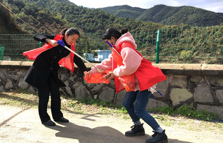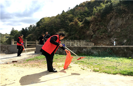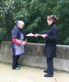 圖為女職工向當?shù)乩先诵麄髑迕魑拿骷罀?/span> 然而,女職工們卻不“安分守己”,以這樣的方式來慶祝自己的節(jié)日:她們兵分二路,一路擔起森林防火宣傳員,向過往群眾發(fā)放《清明文明祭掃和森林防火倡議書》,并對上了年紀的村民耐心講解倡議書內容,將臺州高速的文明服務從工作中延伸到了生活中。一路環(huán)繞水庫去清理其邊上的垃圾,一上午下來,收獲還真不少,共清理廢紙、飲料罐、塑料袋等廢棄物若干袋,在打造“生態(tài)文明”中率先垂范,擔其責,盡其力。