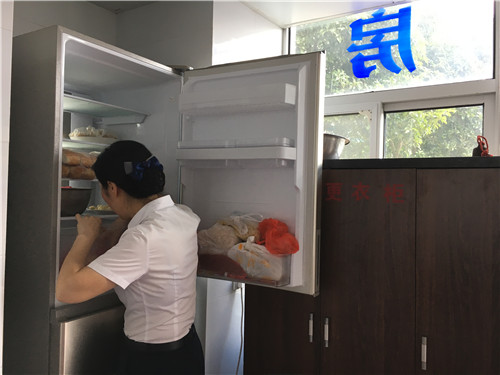 圖為正在檢查冰箱衛(wèi)生