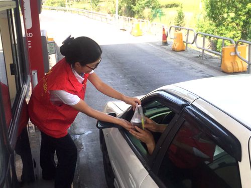 8月10日,臺州南收費所的部分黨員、團員一大早就來到所里,將綠豆紅棗湯、涼粉等消暑物品分杯、添糖、加水、封口,為一年一次的“送清涼”活動作準(zhǔn)備?!八颓鍥觥被顒邮窃撍驹刚叻?wù)隊服務(wù)社會的內(nèi)容之一,是臺州高速的一道風(fēng)景。