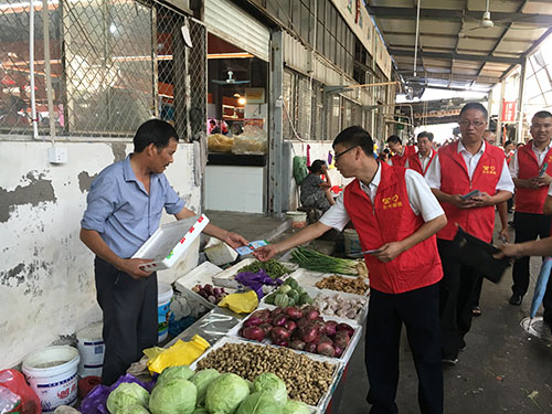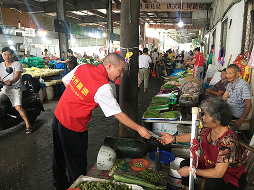 圖為志愿者在菜場宣傳垃圾分類 志愿者們特地選取菜市場、商鋪等人多且容易產生垃圾的地方,向店主和商販們宣講環(huán)境公害引發(fā)的負面后果及如何處理平時的生活垃圾,他們結合宣傳冊通俗、耐心地講解生活垃圾要從源頭開始分類投放:干濕要分開,對剩菜剩飯、瓜皮果殼等易腐垃圾要瀝干水分,投放后要蓋好垃圾桶,免得蚊蠅滋生;紙類、飲料瓶、金屬等有再生利用價值的要放在可回收的垃圾桶里;對電池、電子產品、殺蟲劑、油漆桶等含有害化學物質的要單獨放;剩余的作其它垃圾處理。