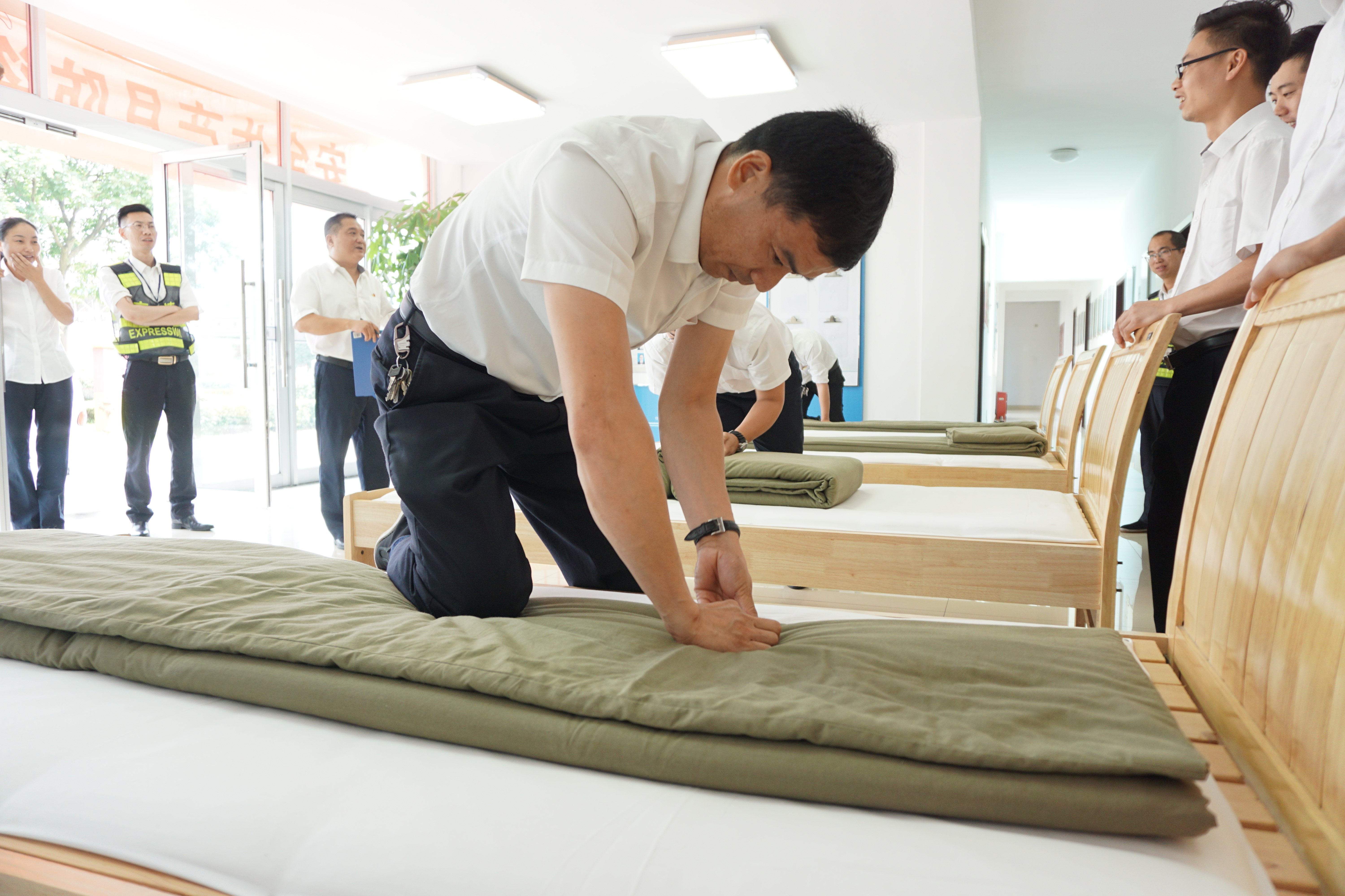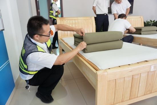 圖為比賽現(xiàn)場 活動現(xiàn)場,裁判宣布比賽規(guī)則及打分標準:評分從被子整體形狀、平整度、棱角明顯、折疊時間等方面判斷,規(guī)定在5分鐘內(nèi)完成,共設(shè)置一、二、三等獎三個獎項。內(nèi)務(wù)半軍事化在該所已是常態(tài),參賽選手們很快進入狀態(tài),從鋪到疊再到整,駕輕就熟,均能在規(guī)定時間內(nèi)整出“豆腐塊”。評委現(xiàn)場進行點評和打分。經(jīng)過競逐,最后副站收費四班何翊平奪得一等獎。比賽分四輪進行,且全程用時不到1個小時。