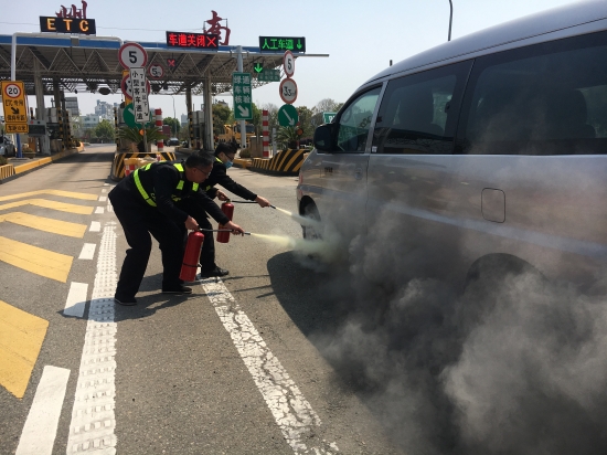 圖為交通事故應(yīng)急演練 在收費廣場交通事故應(yīng)急預(yù)案演練中,該所模擬了汽車在收費車道起火的交通事故。事故發(fā)生后,當(dāng)班班長第一時間啟動預(yù)案,將險情報告監(jiān)控員,并立即關(guān)閉事故車道,組織人員對起火點進行前期壓制,同時指揮人員擺放標(biāo)志,引導(dǎo)后續(xù)車輛,并快速放行。接到險情報告的所長、辦公室人員迅速趕到現(xiàn)場參與救援:女同志協(xié)助班組開足車道;部分男同志負責(zé)出入口車輛的疏導(dǎo)指揮工作;其余人員負責(zé)對火災(zāi)進行撲滅……大家各司其職,快速處理險情。