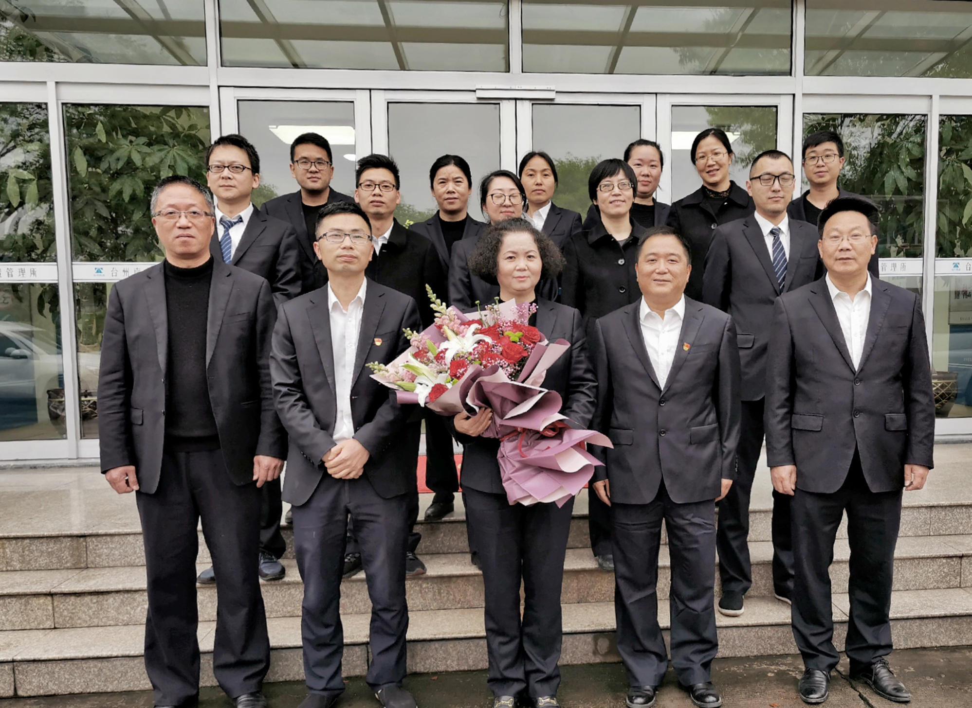圖為大家合影留念 所長王益民為退休員工頒發(fā)光榮退休證書并送上鮮花,大家一起來到收費所大樓前合影留念,將這美好的瞬間記錄下來。 沈芬芳
