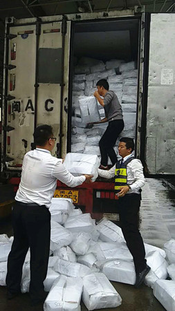圖為工作人員幫忙搬運(yùn)掉落的貨物 這輛滿載海鮮的綠農(nóng)車,貨物掉滿車道,司機(jī)一人束手無策,當(dāng)班班長陳豐平在拍完綠農(nóng)照片后,叫上班員林葉輝,一起快速幫助司機(jī)一件一件地傳遞貨物。盡管每一袋貨物都十分重,但是他們?yōu)榱藥椭鷰煾堤嵩缯碡浳?,顧不得臉上交織的汗水和雨水?/span> 由于工作人員的幫助,司機(jī)離開時(shí)一直道謝。他們對司乘人員的主動援助,使得溫嶺西收費(fèi)所的服務(wù)不單單停留在窗口問候上,還將延伸服務(wù)一直呈現(xiàn)。 陳豐平