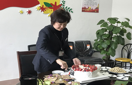 圖為陶秀英同志在歡送會(huì)現(xiàn)場切蛋糕