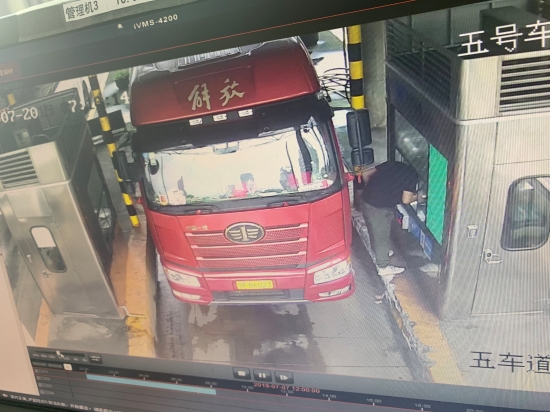 圖為失主遺落錢財(cái)現(xiàn)場(chǎng) 當(dāng)天上午,收費(fèi)班長(zhǎng)李寧巡查時(shí)在第五車道窗口附近發(fā)現(xiàn)了三百元現(xiàn)金,經(jīng)多方確定不是所內(nèi)工作人員遺失后,判斷為過往司機(jī)不小心遺失。為了盡快找到失主,李寧隨即去監(jiān)控室調(diào)取視頻查找。 經(jīng)過監(jiān)控查找,馬上鎖定了一輛車牌為“豫”字開頭的大貨車。原來當(dāng)時(shí)因駕駛室距離窗口較遠(yuǎn),司機(jī)下車付錢,監(jiān)控中清晰顯示司機(jī)在掏錢繳費(fèi)時(shí)三百塊現(xiàn)金從口袋里掉到車道上,但是司機(jī)因?yàn)橼s路絲毫沒有發(fā)覺。確認(rèn)失主后,工作人員查詢司機(jī)電話并取得聯(lián)系,告知其遺失三百現(xiàn)金,在通過微信確認(rèn)身份后,李寧將錢轉(zhuǎn)給了司機(jī)。