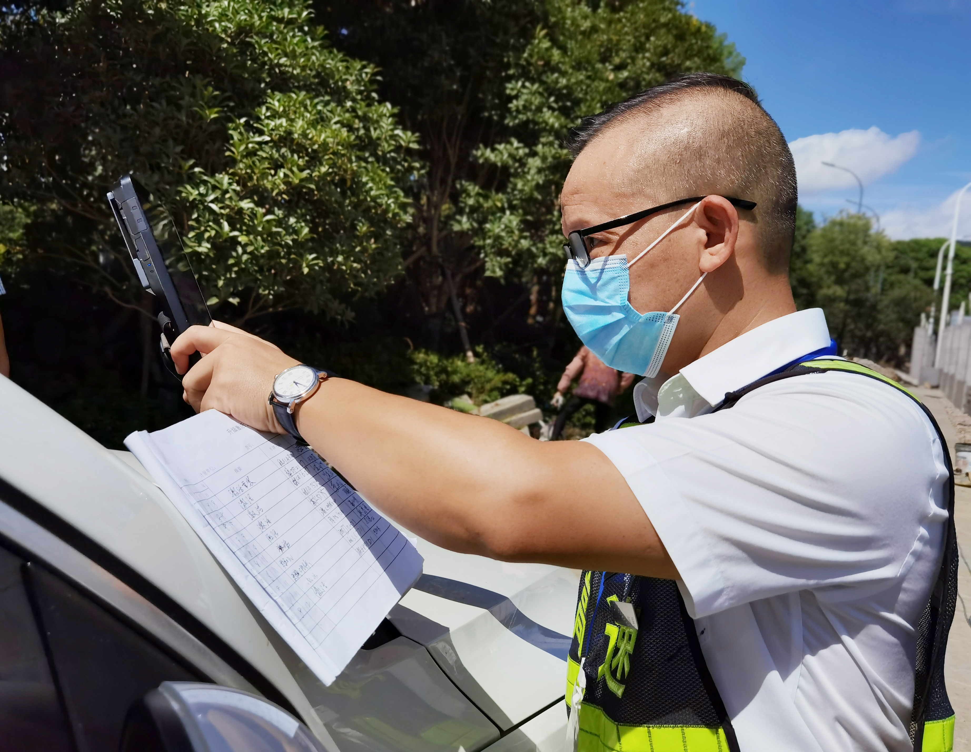 這是征費四班班長鄭星和駕駛員的對話,他手持iPad,不停地在屏幕上滑動著、查詢著。天氣炎熱,大貨車開車時較為顛簸,3M膠軟化黏不牢,ETC設備容易脫落。ETC設備一旦掉落,則會提示“標簽已失效”,就無法正常工作,不能實現(xiàn)不停車出入高速公路ETC車道,給來往司機和收費人員增添了很多麻煩。為全力配合ETC服務需要,鄭星冒著酷暑高溫,不厭其煩地幫著司乘人員解決問題,一天下來工作服濕了又干,干了又濕,他就是臺州高速上的最美堅守者。