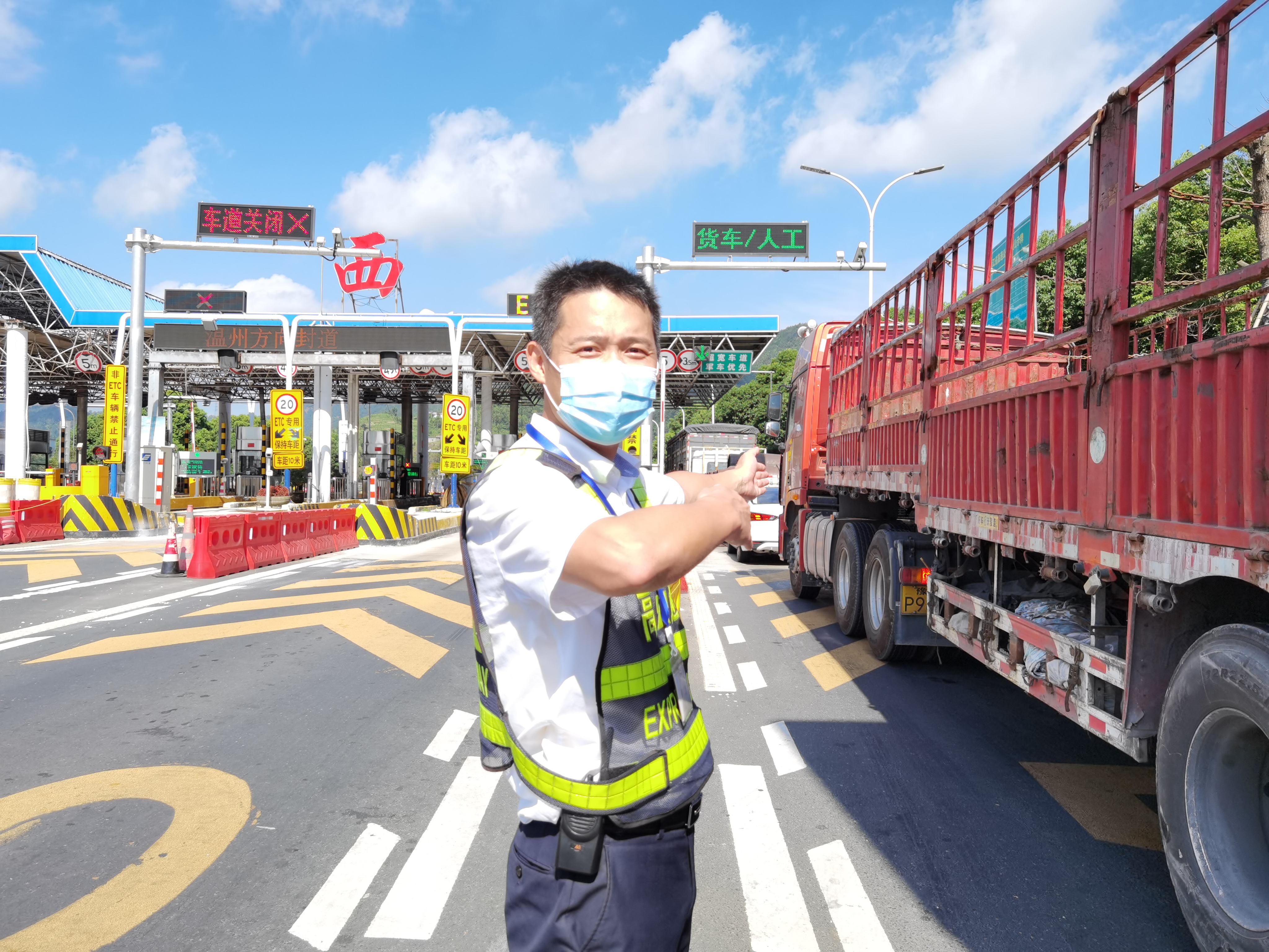 “師傅,慢點,注意后方來車,往左一點。”溫嶺西收費站入口處,一位身高一米七五左右的男同志正在維護著交通秩序。他就是征費三班班長李寧??崾罡邷責o法消磨他的斗志,揮汗如雨對他而言已是家常便飯。溫嶺西收費站車流量大,貨車多,當遇到三超車輛或者節(jié)假日的時候,入口處就會排成長龍。七八月份的太陽十分毒辣,經(jīng)過一天的高溫,收費站入口的馬路上熱浪滾滾,人站在外面不到5分鐘就會汗流浹背。但為保持入口交通的安全暢通,李寧不斷做著各種不同的手勢,指揮著過往的車輛通行,絲毫顧不得擦拭順著臉頰流下來的汗水。他就是臺州高速上的最美堅守者。