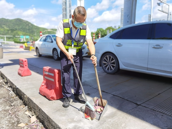 烈日灼燒著大地,高速兩邊的樹葉都被曬得打了卷,悶熱的空氣讓人喘不過氣來,在溫嶺西收費站,不少司乘人員在過站時,隨手將食品的塑料袋、煙頭、塑料瓶等垃圾丟棄在收費站出口處,班長陳軍見到隨時清掃路面,保持收費區(qū)域衛(wèi)生干凈整潔。彎腰、清掃、起運,看似簡單的一組動作,陳軍每天要重復幾十次,衣服一天不知要被汗?jié)穸嗌俦椋?/span>但他堅持以良好的形象展示臺州高速的精神風貌。他就是臺州高速上的最美堅守者。