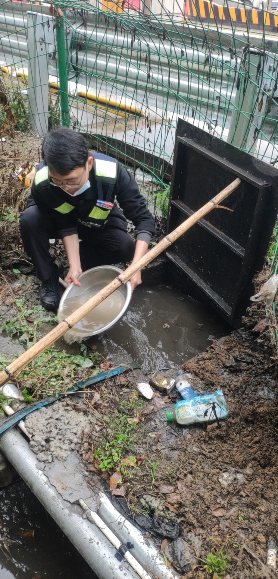 找出原因后,鄭星趕忙跑到所里取來一個水盆和一根木桿子。他用木桿支起排水坑上的蓋板,將坑里的積水一盆一盆地舀到旁邊的排水溝里。引導(dǎo)完車輛的林華平也過來協(xié)助鄭星。雖然此時外面下著雨,但他們?nèi)粵]顧上,只盼著舀水這個措施能夠有效,11號車道能夠早點恢復(fù)使用,進(jìn)口秩序能夠早點恢復(fù)正常。 最后在鄭星和林華平的冒雨搶修下,排水坑里的水位總算有所下降,11號車道在關(guān)閉二十多分鐘后終于恢復(fù)使用,進(jìn)口車輛也恢復(fù)暢通。 因地磅傳感器長期被雨水浸泡,可能還存在一些潛在問題。再者,排水坑里的水位雖有所下降,單憑人力實在無法在短時間內(nèi)排掉剩余積水。考慮到這些問題,班長在搶修過后又將情況匯報給了維養(yǎng)中心,維修人員后序針對地磅問題進(jìn)一步展開排查和維修工作。 趙育辰