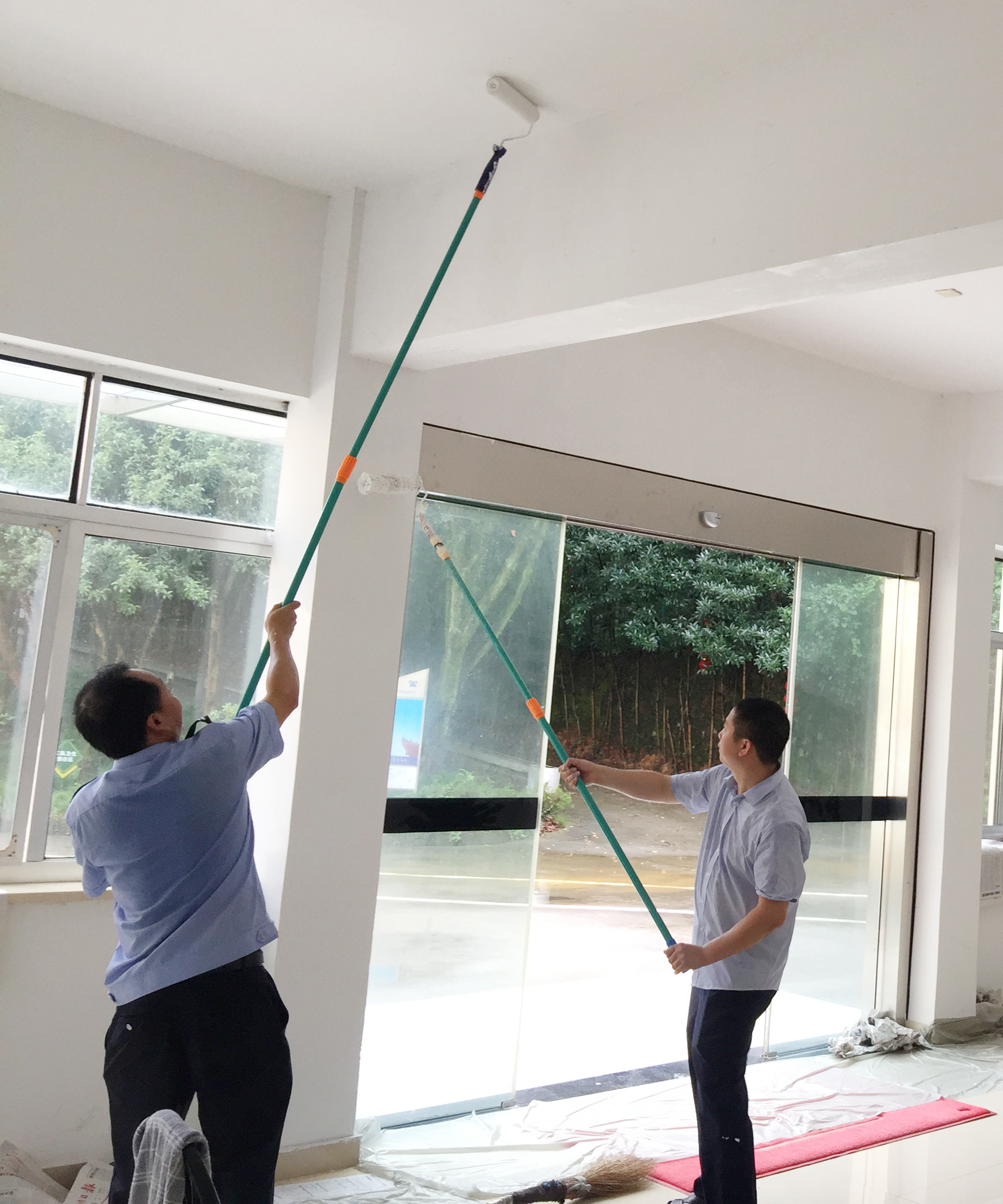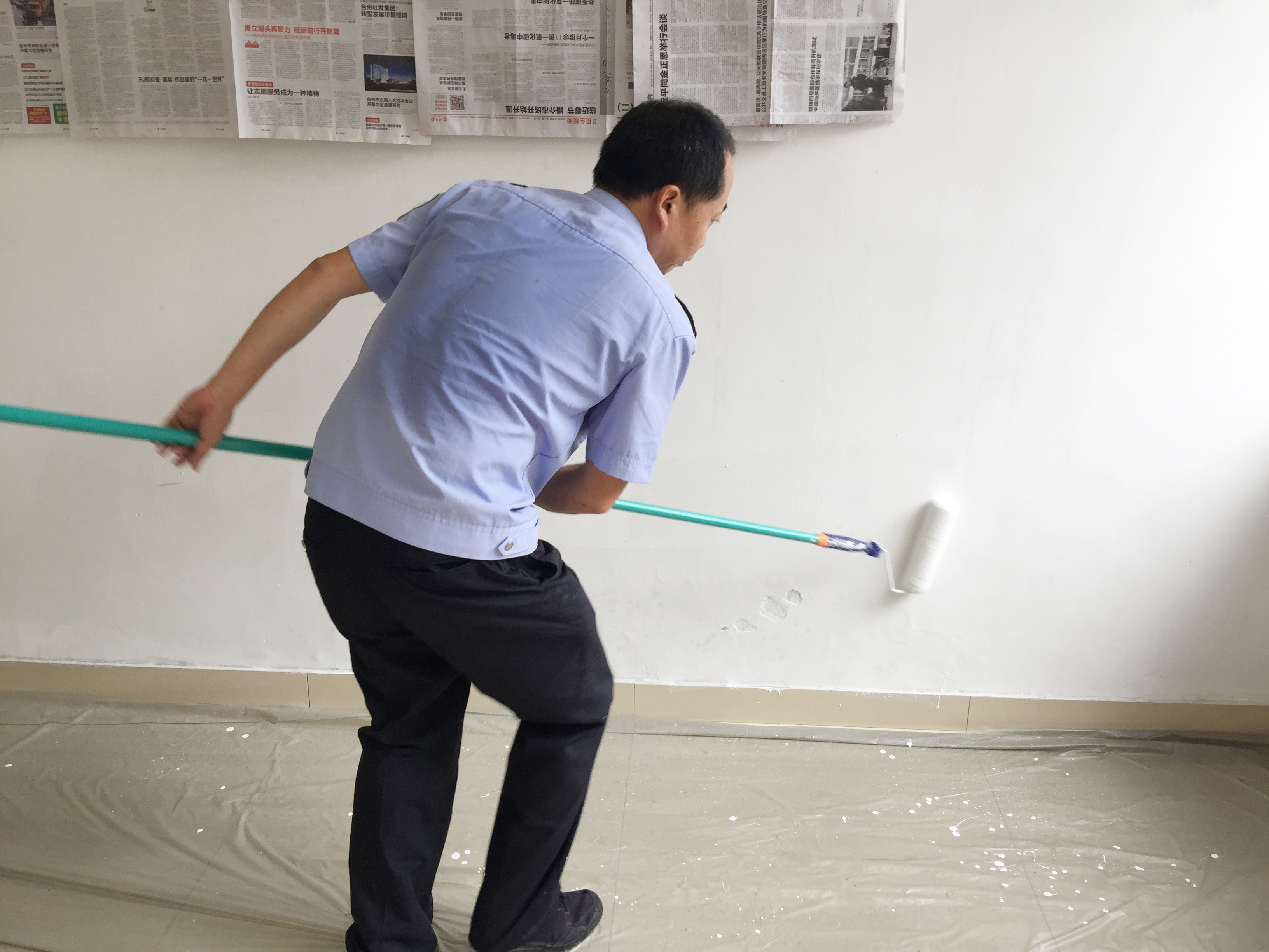 圖為“粉刷匠”粉刷現(xiàn)場 現(xiàn)場,工具備齊后,大家捋起袖子開始動工。家里正在裝修的林通,有著豐富的粉刷經(jīng)驗,指導大家如何將墻體粉刷得平整又美觀。分工明確后,有的拿起粉刷棒,有的攪拌涂料,有的鋪墊報紙及塑料紙,有的清理刷墻后殘留在地面的垃圾。整個勞動過程中,各個動作麻利,干勁十足。粉刷是個技術活,更是個力氣活,只見浸滿涂料的刷子在墻上揮舞著,個個汗如雨下,卻都顧不得休息,在大家的齊心協(xié)力下,原本一片灰不溜湫的墻壁變得雪白光潔。 這次義務勞動,不僅美化了站所環(huán)境,營造出廉潔的工作氛圍,增強了員工的凝聚力和向心力,更增加了全體員工對公司的一份熱愛。 林玲