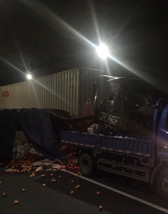 圖為事故現(xiàn)場(chǎng) 得知此情況,所負(fù)責(zé)人第一時(shí)間趕赴事故現(xiàn)場(chǎng)。事故就是命令!救援隊(duì)伍立即兵分三組,一組由駕駛員林通用巡邏車送傷者至臺(tái)州收費(fèi)所出口,與前來救援的120救護(hù)車進(jìn)行對(duì)接,一組由金志輝、宋勤滿在寧向南洞口卡口,一組由李海福所長(zhǎng)、應(yīng)錦清副所長(zhǎng)在現(xiàn)場(chǎng)協(xié)調(diào)指揮,同時(shí)配合交警維護(hù)通行秩序,與交警一起對(duì)事故現(xiàn)場(chǎng)展開救援。 經(jīng)了解,由于藍(lán)色貨車超車道緩慢行駛,集裝箱與貨車發(fā)生車輛剮蹭追尾導(dǎo)致后方送桔貨車側(cè)翻。貨車上的桔子多半散落,給清障帶來一定的難度,管理所負(fù)責(zé)人、高速交警、清障人員、養(yǎng)護(hù)人員共同當(dāng)起了“指揮員”、“搬運(yùn)工”,全力清理事故現(xiàn)場(chǎng)。 16時(shí)36分,由于處理及時(shí),措施得當(dāng),事故未造成大面積擁堵,道路恢復(fù)正常通行。 林玲