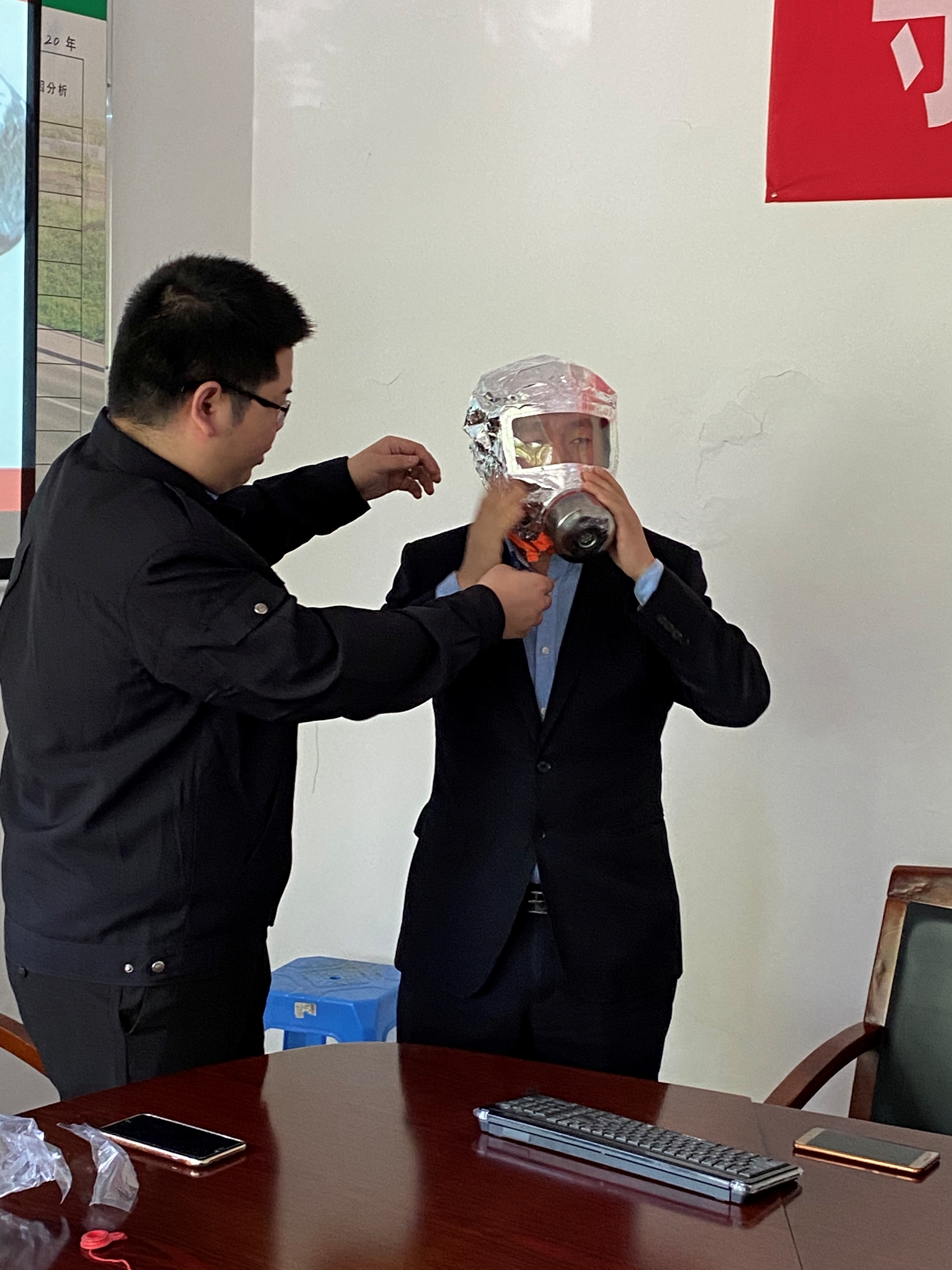圖為空氣呼吸器佩戴演練 培訓(xùn)分為講座和演練兩個部分。在培訓(xùn)課上,臺州消防大隊楊教官結(jié)合近年來發(fā)生在臺州觸目驚心的火災(zāi)案例,以視頻、圖片的形式生動地闡述了消防安全工作的重要性和嚴(yán)峻性,通過現(xiàn)場展示詳細(xì)介紹了干粉滅火器、水基滅火器的各自特點和使用方法、適用的場所,全面介紹了日常工作生活中應(yīng)注意的消防安全細(xì)節(jié)以及如何撲救初期火災(zāi),火災(zāi)中如何自救、空氣呼吸器佩戴使用、逃生等知識。
