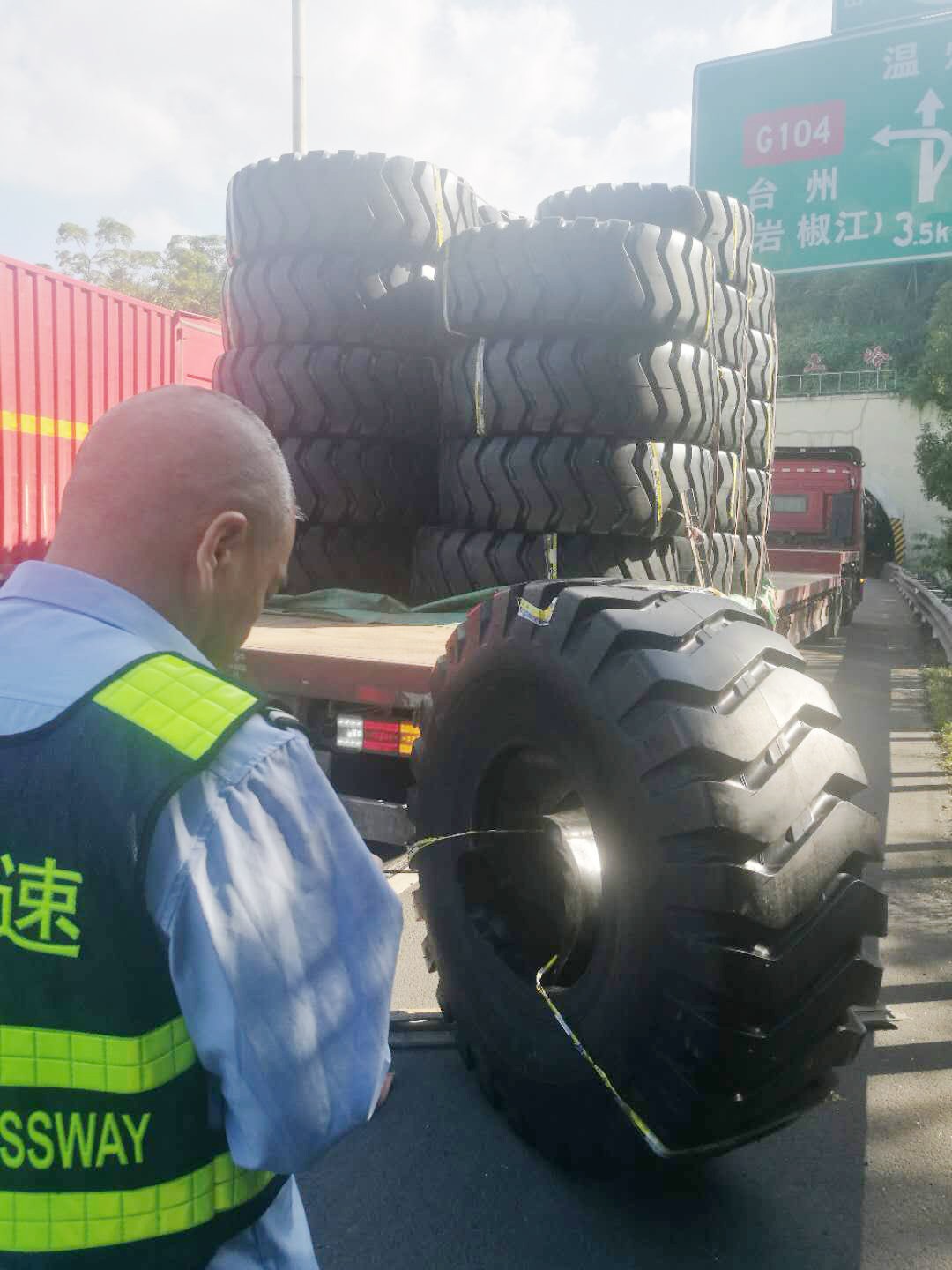 執(zhí)勤隊接警后立即趕往事故地點,一輛運載輪胎的貨車??吭谥鬈嚨?,其中一個巨型輪胎滑落到硬路肩上,致使后方車輛紛紛避讓。為及時消除險情,執(zhí)勤隊快速在現場做好安全警戒工作,同時將現場情況反饋給監(jiān)控中心。由于貨車綁繩索松動,重達300多斤的輪胎脫落在地,隨后執(zhí)勤隊協同施救中心、駕駛人員合力將掉落的輪胎先拖至車旁,經過長達半個小時的搶險,跌落的貨物終于完好無缺地回到貨車上,道路恢復暢通。 筆者溫馨提醒:在高速公路行駛過程中,駕駛人應注意將車上的貨物固定好,途中要隨時注意貨物及捆綁繩索是否松動。無論是車輛撒落物還是人為拋灑物,都會給道路安全暢通埋下了重大隱患! 林玲