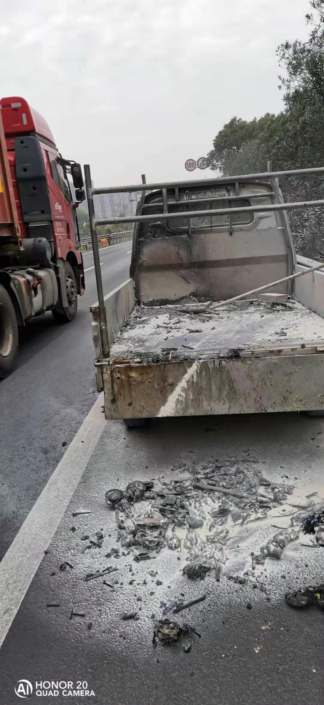 3月10日清晨7點46分,一輛五菱小貨車裝載物莫名起火,驟停在黃土嶺隧道溫向出洞口100米左右的硬路肩,情況十分危急。