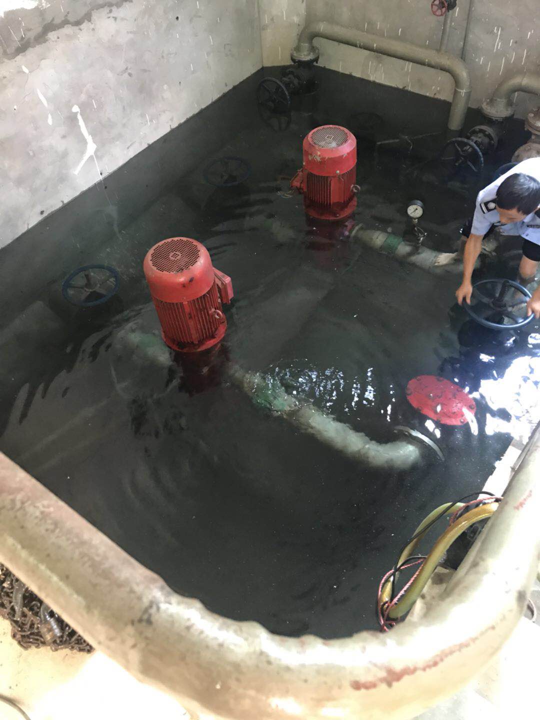 圖為執(zhí)勤隊(duì)員在關(guān)閉閥門 “看,應(yīng)該是這里漏水了,有水暈在動(dòng)。” “對(duì),就是這里了?!?/span> “水馬上要沒到電機(jī)了,趕快關(guān)閉閥門,不然損失就大了。” 此時(shí),陳旦平?jīng)]有多想,立即下水去關(guān)閉水泵閥門。池中有2號(hào)泵的高位水池閥門和2號(hào)泵的集水池閥門,每個(gè)泵各有兩個(gè)閥門。陳旦平在迅速關(guān)閉閥門后,由于集水池這邊地勢(shì)較低,慌忙中的他忘拿手機(jī),手機(jī)被水浸到,他卻依舊埋頭于搶修。 據(jù)隊(duì)長(zhǎng)李新波說,此次“水災(zāi)”是北泵房2號(hào)泵的壓力表處水管漏水,原因是設(shè)備設(shè)施使用時(shí)間較長(zhǎng),水管陳舊銹蝕,抵不住水壓,導(dǎo)致水管開裂,引起漏水。 胡瑰華