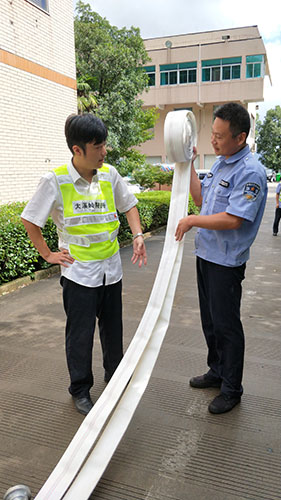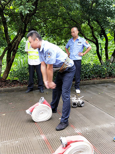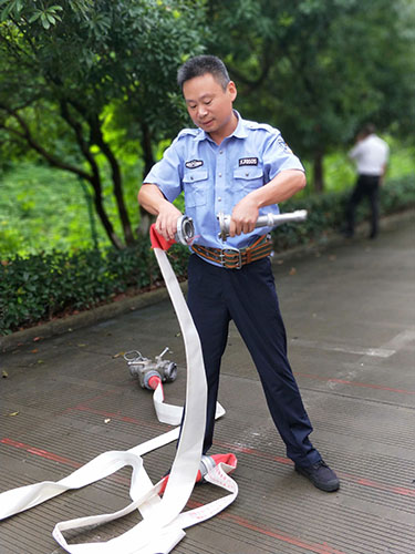 圖為主講人馮常敏操作示范現(xiàn)場 現(xiàn)場,“馮大師”腳下放著兩盤水帶,站姿已成“丁”字步,雙腿微曲,兩拇指與食指握住水帶根部,使虎口以順時(shí)針方向?qū)?zhǔn)接口處,做好甩開的準(zhǔn)備?!八Φ谝槐P水帶,要運(yùn)用手腕的力量,要提起水帶并高于地面20到30厘米,再用大臂帶動小臂的力量向前甩出?!?“馮大師”耐心地指導(dǎo)。 接下來是兩盤水帶連接的關(guān)鍵時(shí)候,“馮大師”左右手熟練操作,將如何連接的操作細(xì)節(jié)一一展現(xiàn)出來,同時(shí)邊操作邊說明注意事項(xiàng),整套動作連貫又迅速,操作一氣呵成,一旁的新人仔細(xì)觀摩學(xué)習(xí)。