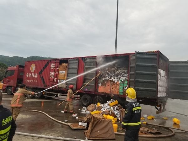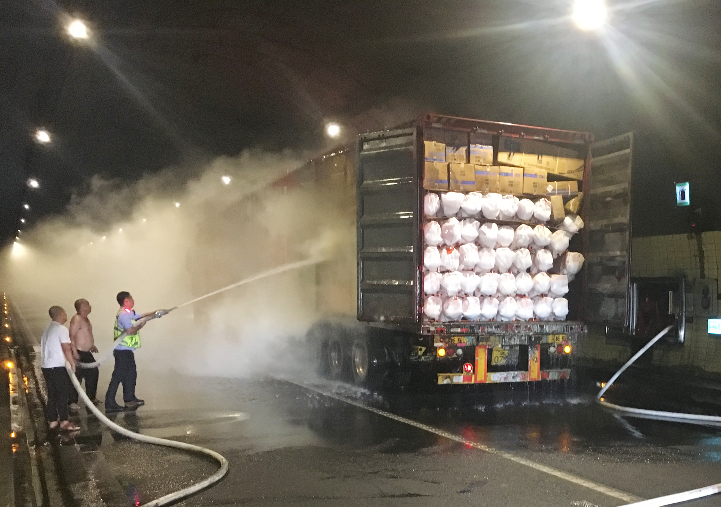 萬(wàn)幸的是,恰逢溫州高速交警巡邏車經(jīng)過(guò),隨即在該貨車后方預(yù)警,很快的所巡邏車、消防車先后到達(dá)現(xiàn)場(chǎng)協(xié)同滅火。由于該車貨物較多,且裝載物皆為紙箱和塑料,集裝箱底層溫度較高,一時(shí)只能將明火撲滅,但車廂內(nèi)仍有大量煙霧,為了安全,車子必須盡快撤離隧道,執(zhí)勤隊(duì)當(dāng)即決定讓駕駛員把車開(kāi)往南廣場(chǎng)繼續(xù)滅火,消防車則一路緊隨其后滅火,以防火勢(shì)變大。