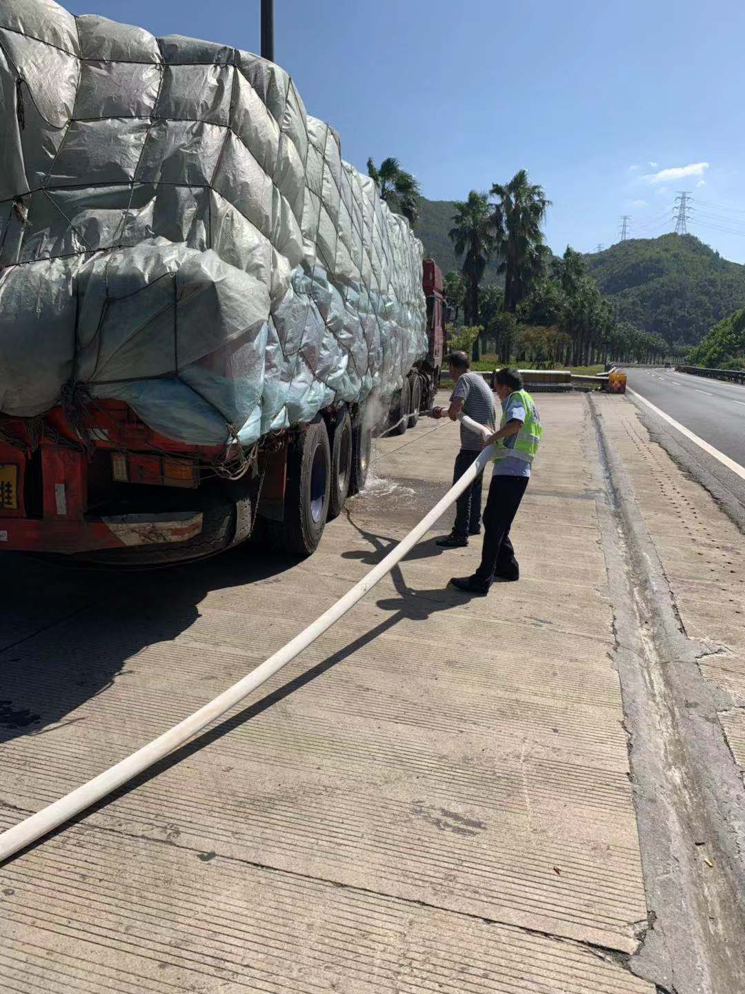 圖為消滅隱患現(xiàn)場 同時,中控員密切關(guān)注車輛動向,13:37,中控員在隧道南廣場發(fā)現(xiàn)該車,巡邏車立即奔赴現(xiàn)場,該車后輪胎剎車位置在冒煙,司機正用礦泉水澆輪胎,隊員們見狀,火速上前把消防栓打開,接上消防水帶,交與該車司機,托著消防水帶,對準(zhǔn)輪胎接連猛射,冷卻剎車片,輪胎終于沒有冒煙,一場隱患被隊員消除了。 據(jù)悉,該輛半掛車因輪胎爆炸,引起冒煙,司機卻想著從下一個高速出口,幸好隊員們監(jiān)控及時,出警迅速,施救到位,把隱患扼殺在搖籃里,沒在隧道內(nèi)發(fā)生火災(zāi),不然后果將無法想象。 現(xiàn)場,隊長告知司機,萬一車輛發(fā)生火災(zāi),請把車停在隧道外,若在隧道內(nèi)發(fā)現(xiàn)車輛起火,請加速駛往隧道口,盡快駛離隧道,避免造成人員傷亡。 陳智慧