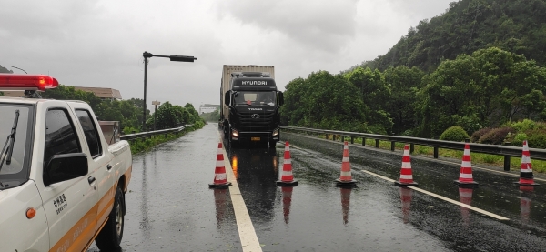 08:12分,接溫州交警通知,受臺(tái)風(fēng)影響,高速上很多車輛發(fā)生側(cè)翻事故,要求隊(duì)員們在溫向隧道口進(jìn)行封道,隊(duì)員們接警后立即在洞口卡口預(yù)警。