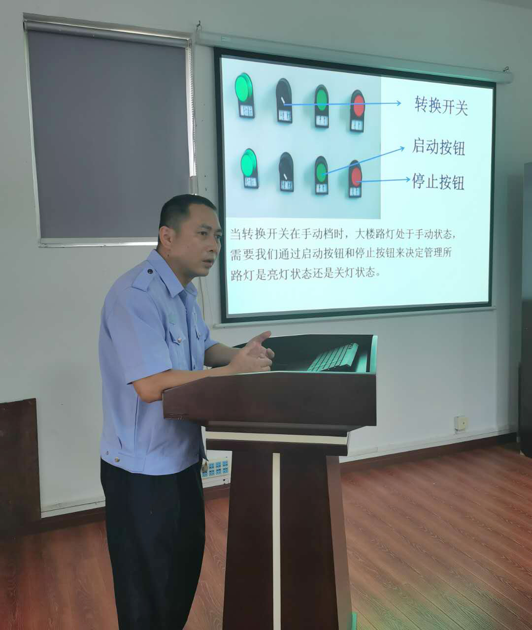 圖為電工業(yè)務(wù)培訓(xùn)現(xiàn)場 湯寧光在電工崗位已經(jīng)19載,有著豐富的工作經(jīng)驗(yàn)。他用聊家常的方式來講解線路控制的工作原理圖、電路的故障排除方法、光控開關(guān)的接線方法,PPT課件中配有隧道所配電房中相應(yīng)的照片和線路圖,并注解,簡潔明了,通俗易懂。在授課過程中,他每講到一處結(jié)尾,便與聽課人員互動(dòng),現(xiàn)場為大家答疑解惑,課堂氛圍熱烈,互動(dòng)感很強(qiáng)。