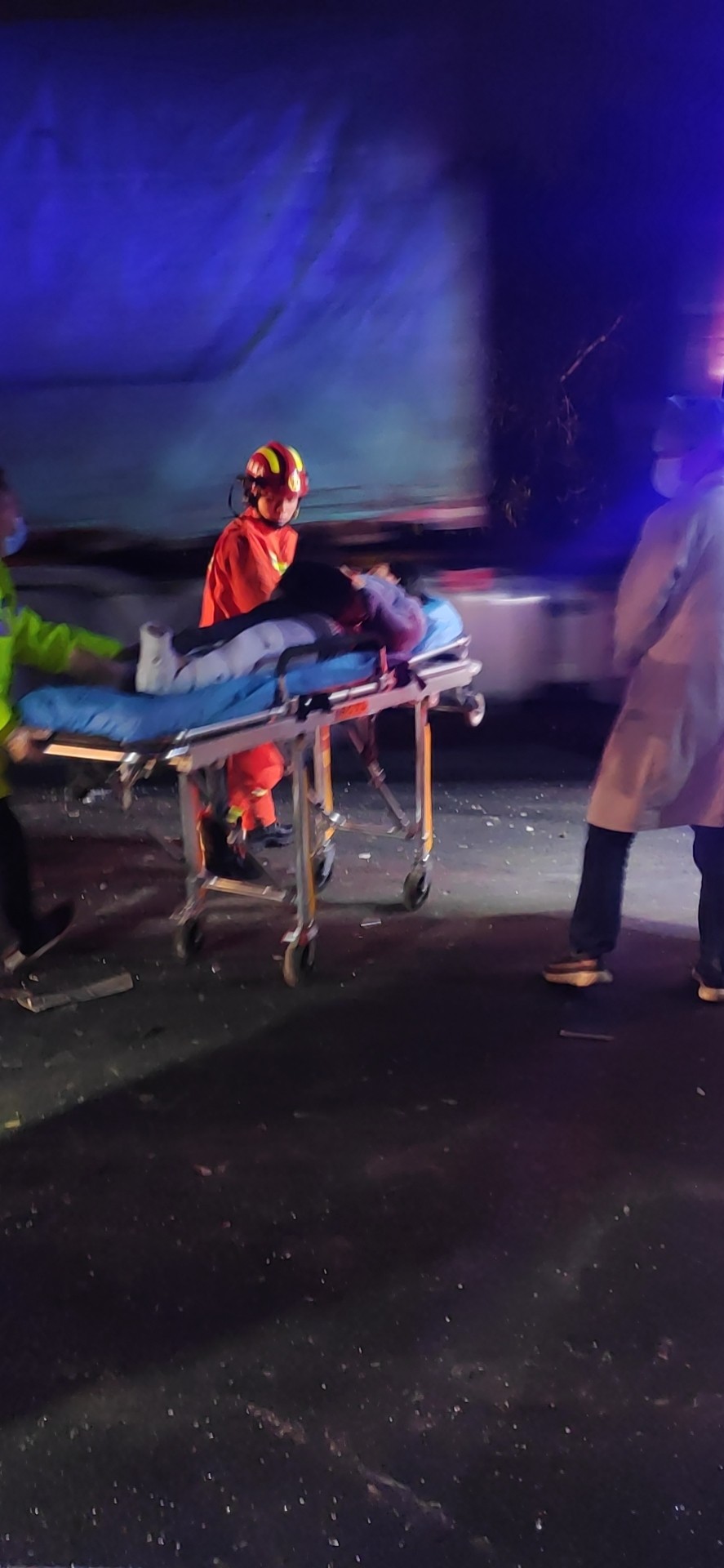 21:50巡邏車和消防車同時到達現場,隊員陳幸飛快的跑下來,以百米沖刺的速度做好巡邏車的安全措施和預警工作,有3人受傷,事故車頭已嚴重變形,一名女性腰部受傷坐在地上,語速正常,思維清晰。還有二名人員被卡在駕駛室,消防隊員正在查看現場準備施救,受傷人員哭爹喊娘嚎聲不斷,由于救護車還沒達到現場,陳幸在事故車后方硬路肩上維護秩序,防止車輛占道,并同時迎接救護車,湯寧光則在維護現場秩序,阻止其他司機圍觀影響救援。 22:00第一輛救護車到達。醫(yī)護人員準備擔架,另一名醫(yī)生去詢問坐在地上的受傷人員,由于車頭嚴重變形,司機與鄰座的人都被卡在駕駛室,經過消防員的救援,受傷最嚴重的司機首先被救了下來,在被救下的那刻暈了過去,醫(yī)護人員立該把傷員抬上救護車,緊接著消防員救下第二位被卡傷員,第二輛救護車帶著傷員離開,最后一輛救護車卻遲遲沒到,經聯系監(jiān)控中心后得知救護車已上高速,但因后方車輛太多,救護車和拖車都被堵了,經和臺州高速交警協商后,最后清理一個車道讓救護車和拖車先開上來,巡邏車去事故車后方預警,22:30救護車帶走最后一名傷員,事故車被拖走,路面恢復正常通車。