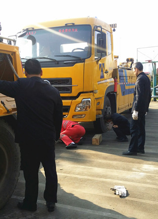 圖為演練現(xiàn)場 廣場上,當(dāng)指揮員下達(dá)“拖車兩次增高作業(yè)演練開始”口令后,拖車在輔助工的引導(dǎo)下,駕駛員將拖車緩緩地倒到故障車的前面,停穩(wěn)后,輔助工立馬從工具箱里拿出托叉、方木等附件,將托叉插入托叉座,調(diào)整好位置,駕駛員操縱操作手柄進(jìn)行第一次托舉鋼板作業(yè)。當(dāng)抬高一定高度后,輔助工將方木填在前輪胎下面,然后放下托臂,重新調(diào)整好位置,進(jìn)行第二次托舉工字梁作業(yè),直到達(dá)到安全高度,輔助工才抽出方木,駕駛員迅速將故障車拖離現(xiàn)場。兩次增高作業(yè)順利完成,演練達(dá)到了預(yù)期效果。 演練現(xiàn)場,氣氛熱烈,員工們針對復(fù)雜車型和去年拖車過程中發(fā)生的事故案例,相互探討,并紛紛表示在今后的工作過程中,要根據(jù)車型的實(shí)際情況,掌握各種作業(yè)技巧,同時要吸取事故教訓(xùn),增強(qiáng)安全意識,確保作業(yè)安全。 何先林