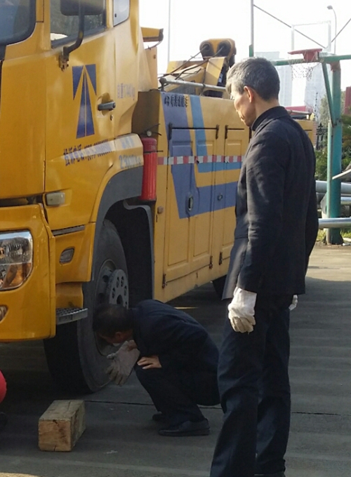 圖為維修現(xiàn)場 救援車輛停在了半路,變成了被救援的車輛,然而施救中心其他的救援車全部行進(jìn)在路上,一直到下午五點(diǎn),終于等到姍姍來遲的救援車將已經(jīng)動彈不得的這輛救援車拖回臺州收費(fèi)所。經(jīng)檢查,居然是離合器片損壞,這幾天由于工作量大,施救車輛超負(fù)荷運(yùn)轉(zhuǎn),離合器片也超常運(yùn)作,加劇了磨損,導(dǎo)致離合器片消耗殆盡。