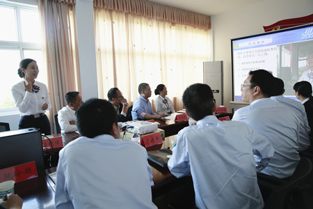 圖為培訓(xùn)師講解實(shí)際培訓(xùn)中的文明服務(wù)技巧