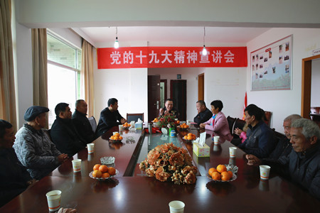 圖為公司黨委副書記、總經(jīng)理張建平村兩委成員、支部黨員宣講十九大精神