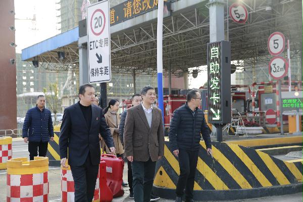 圖為市行政服務(wù)中心黨委副書(shū)記金偉一行在臺(tái)州收費(fèi)站參觀學(xué)習(xí)
