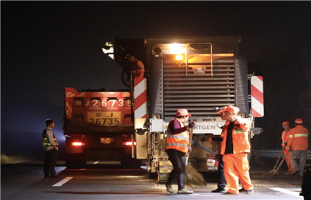 確定日期時(shí)間。施工前夕工程部負(fù)責(zé)人反復(fù)與交警、路政等部門溝通協(xié)調(diào),渠道暢通,最終達(dá)成一致意見(jiàn),為盡量避免給公眾出行帶來(lái)影響,施工基本采用夜間斷流封道方式進(jìn)行。施工過(guò)程中與高速交警、路政配合默契,封道都在規(guī)定時(shí)間內(nèi)開(kāi)始結(jié)束,盡所能減輕施工對(duì)高速營(yíng)運(yùn)影響,保證路段通行能力。