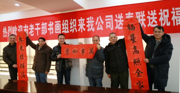 市老年書畫研究會(huì)會(huì)長(zhǎng)楊通河一行來(lái)公司送春聯(lián)送祝福 1月17日下午,市老年書畫研究會(huì)會(huì)長(zhǎng)楊通河,市直機(jī)關(guān)老干部書畫協(xié)會(huì)領(lǐng)導(dǎo)施巨日、陳孔梅一行來(lái)公司送春聯(lián)送祝福,感謝公司對(duì)研究會(huì)的支持和關(guān)愛(ài),祝愿公司在新的一年里紅紅火火,萬(wàn)事如意,經(jīng)營(yíng)發(fā)展越來(lái)越好。