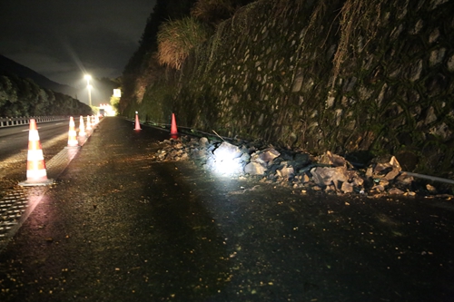 經(jīng)檢查發(fā)現(xiàn),因多日連續(xù)降雨,導(dǎo)致山體表面土層濕化,引起隧道入口處高邊坡部分塌方,約2立方碎石散落在硬路肩及車道上,在高邊坡二級平臺上,距路面高度約12米處有一塊約0.5立方的大石突出在外,觸目驚心,隨時都有掉落的可能。