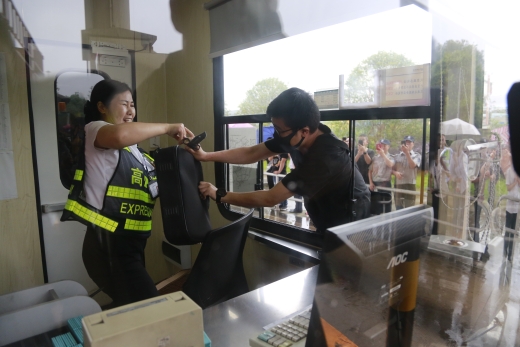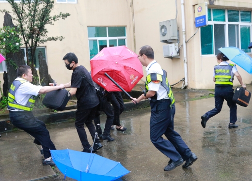 隨后,多名參演員工冒雨模擬收費崗亭和列隊下崗遭遇“歹徒”搶劫的情景開展防盜搶演練?,F(xiàn)場,2名蒙面歹徒執(zhí)仿真刀、軟棍威脅收費員交出現(xiàn)金,危機之中,收費站立即啟動應急處置預案并報警求助,收費員有效與歹徒周旋,應急處置組人員迅速攜鋼叉、橡膠棒、勞動工具等赴現(xiàn)場支援,值班領導、收費班長、監(jiān)控員合力協(xié)作應對歹徒,防盜搶演練順利結(jié)束。