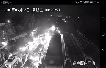 5月1日8:27分,黃土嶺隧道發(fā)生多起多車追尾現(xiàn)象,事故現(xiàn)場仿佛貪吃蛇,二車追尾、三車追尾、四車追尾,特別是四車追尾現(xiàn)場,除了追尾車輛車頭凹陷變形,被撞車輛車尾面目全非外,一輛白色SUV更是被后車頂?shù)角耙w上,3名司乘人員受傷。隧道所監(jiān)控員洪慧雯不斷切換鏡頭,向指揮中心、醫(yī)院發(fā)出報告;早已到達的隧道所執(zhí)勤隊已在現(xiàn)場維持秩序,引導后方車輛通行,為交警、急救和施救車輛開通生命通道;與此同時,臺州、臺州南和溫嶺西收費所暫時關(guān)閉寧向入口。