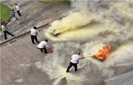 “趕快救火!”隨著教官一聲令響,比武正式開始。“消防員”們個個行動神速,鎮(zhèn)定地手持滅火器,拔掉保險銷,對準(zhǔn)著火點(diǎn)壓下手把噴射,動作連貫一氣呵成。