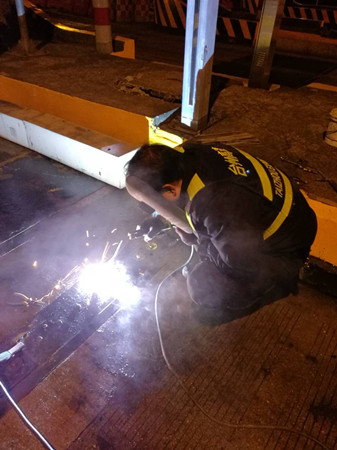 到了現(xiàn)場(chǎng),隊(duì)員發(fā)現(xiàn)該車(chē)道輪檢器鐵板螺孔由于不斷摩擦并逐漸變大,導(dǎo)致整顆螺栓脫離底下固定螺座,加之當(dāng)天是春節(jié)高速免費(fèi)第一天,車(chē)輛經(jīng)過(guò)時(shí)車(chē)速都較快,直接將整塊鐵板帶離底座。如果不及時(shí)對(duì)鐵板進(jìn)行加工恢復(fù),不僅不能保護(hù)下面的輪檢器,而且還有可能造成車(chē)輛爆胎??沙σ谷考庸S(chǎng)都已關(guān)門(mén),如果讓廠(chǎng)家發(fā)貨至少也要好幾天。正在兩難之際,中心副經(jīng)理葉俊想到將鐵板與底座邊緣直接焊死的臨時(shí)應(yīng)急方法,待節(jié)后再向廠(chǎng)家定制或重新購(gòu)買(mǎi)。 方案有了,大家兵分兩組,一組去中心倉(cāng)庫(kù)拿電焊機(jī)、電焊條等設(shè)備,一組待在原地清理鐵底下方於泥等雜物,為隨后的電焊工作做準(zhǔn)備。設(shè)備到位后,葉俊一手操起電焊罩,一手熟練的將電焊條點(diǎn)在了鐵板與底座邊緣之間,經(jīng)過(guò)近一個(gè)小時(shí)的處理,輪檢鐵板與地面底座牢牢地固定在一起,再也不用被飛馳而過(guò)的車(chē)輛帶離。 項(xiàng)寅曉